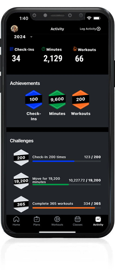 Track Fitness Progress, Earn Achievement Badges and Complete Challenges for Check-Ins, Minutes, and Workouts.