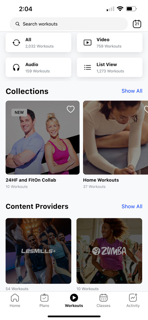 Yes. 24GO® has more than 2,000 workouts ranging from Cardio, Strength and Recovery with Collections from Les Mills, FitOn, Zumba and Kettlebell Kings. And check out the 24 Hour Fitness Workout of the Day for a new and popular workout each day.